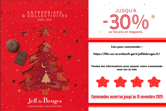 Votre équipe ASC vous propose de commander jusqu’à – 30 % vos chocolats Jeff de Bruges dans le catalogue de Noël spécial Entreprises et Collectivités. Vous pourrez choisir où récupérer votre commande, parmi l’un des 12 points de livraison répartis sur le territoire des Hauts-de-France, (auprès de vos représentants de proximité ou membres du CSEE). Vous avez jusqu'au...