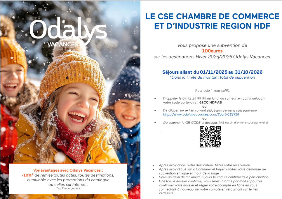 Votre CSE a le plaisir de vous informer de la reconduction du partenariat avec ODALYS jusque octobre 2026 ! Cette offre valable dès à présent vous permet de bénéficier d'une remise de 100 € sur le site de location de vacances ODALYS ! Pour en profiter c'est très simple : Par téléphone : appelez le...