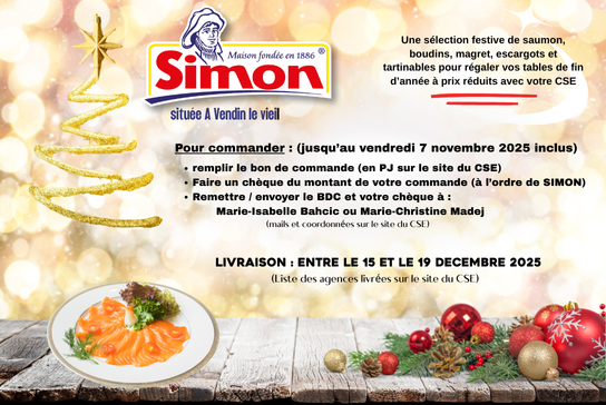 Votre CSEE vous propose une vente groupée à tarif préférentiel de produits de la Maison Simon ! La maison SIMON est basée à Vendin-le-Vieil et existe depuis 1886. Pour bénéficier de l'offre : - Télécharger et remplissez le bon de commande - Joignez un chèque avec le montant correspondant - Transmettez le tout à Marie-Isabelle...